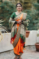 This saree showcases the rich heritage of Paithani weaving, originating from Maharashtra, and is renowned for its luxurious texture and intricate motifs. The double-pallu design adds a contemporary twist, making it a perfect choice for special occasions.